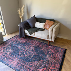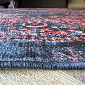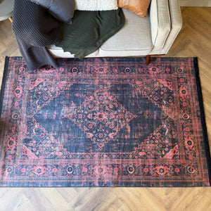 Add bold character and warmth to your space with the Flosker Machine Washable Vintage Crimson Rug. Designed with a striking Persian inspired medallion, this piece blends deep charcoal tones with rich crimson detailing to create a dramatic yet refined look. The distressed finish gives it that lived in, vintage charm while keeping the overall feel modern and versatile.