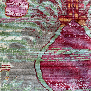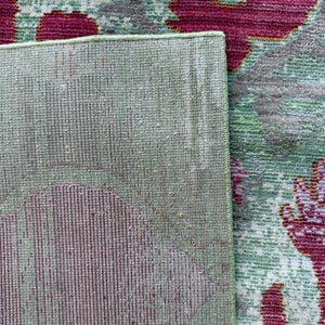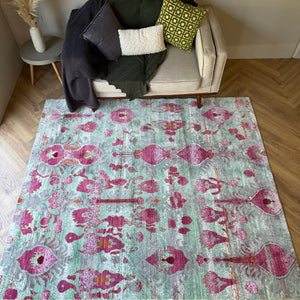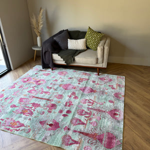 The Mint Mirage Ikat Rug is a bold statement piece that blends soft pastel tones with rich magenta detailing in a distressed, artistic finish. Set against a washed mint green base, the abstract ikat-inspired motifs create a layered, almost hand-painted effect that feels both vintage and modern at the same time.