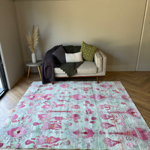 The faded texture gives it that slightly worn, lived-in look, which makes it perfect for contemporary homes that want colour without looking too formal. The mix of mint, blush, deep pink and subtle neutral tones helps it pair beautifully with timber flooring, cream sofas and natural décor.