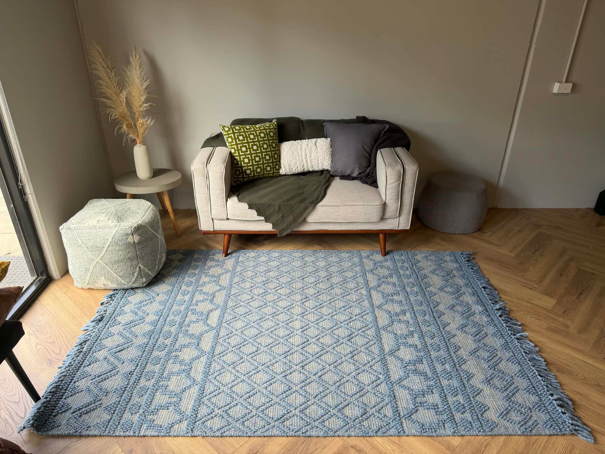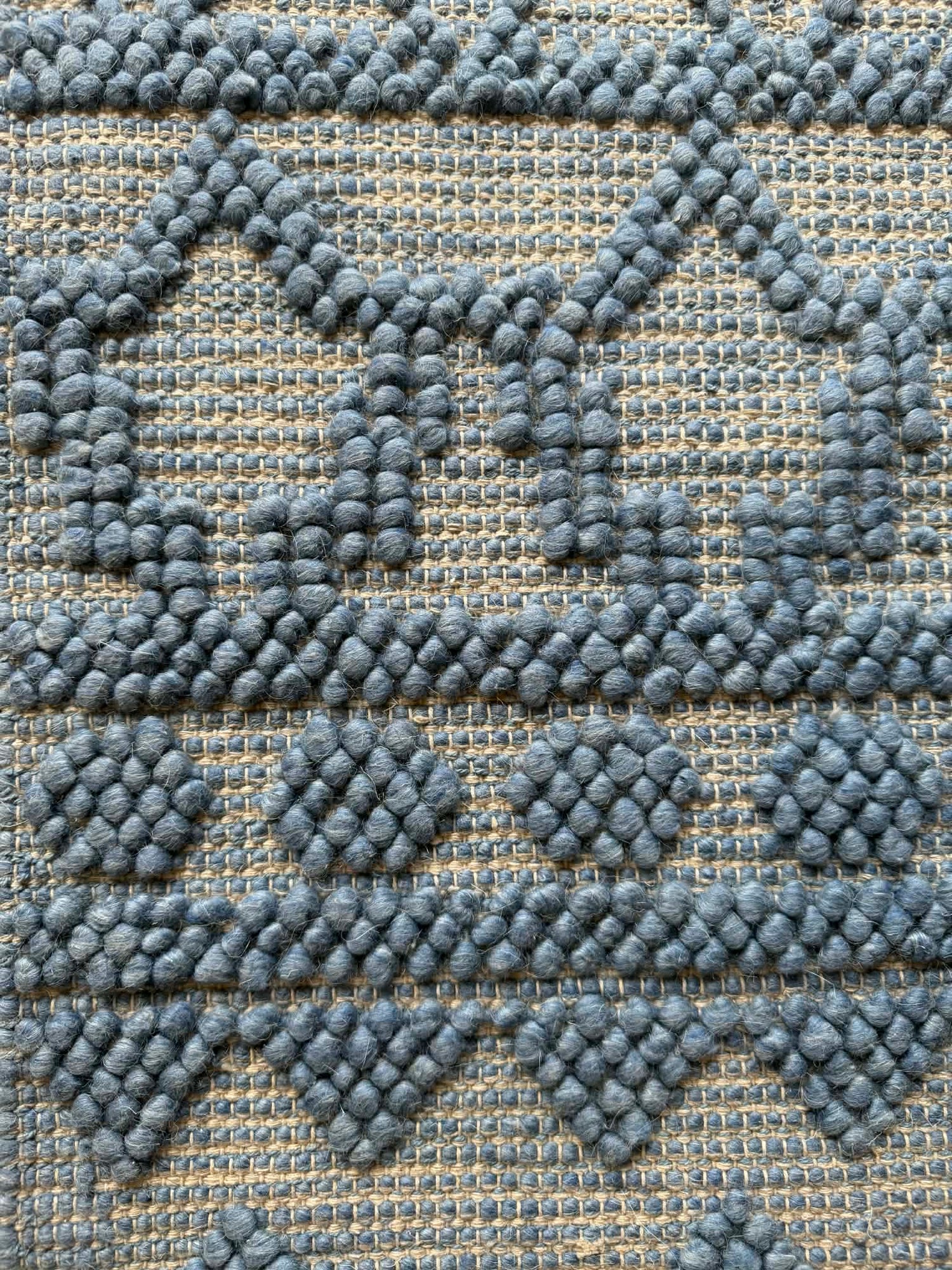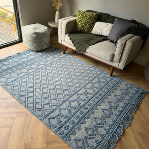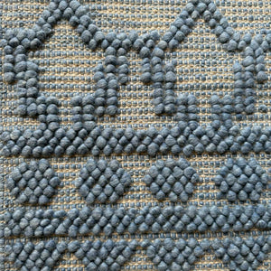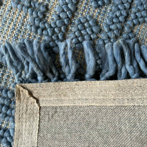 The raised wool detailing creates a dimensional surface that feels rich underfoot, while the structured base weave keeps it durable and grounded. The fringe edges add a relaxed, artisanal finish that suits coastal, bohemian, and contemporary interiors.