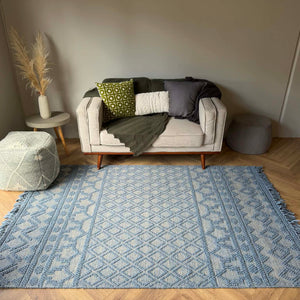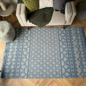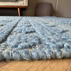 Add depth and character to your space with the Coastal Nomad Textured Wool Rug. Featuring a layered geometric design in soft denim blue and natural tones, this rug blends bold pattern with handcrafted texture.